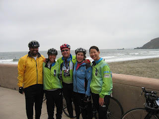 Mel and I were really busy the last week heading into the ride...we basically had one last training ride with Jerry and crew to Point Reyes on September 23. After that, there was no more time for biking. I basically bought a new bike thing every day to get ready. We were wrapping stuff up at work, trying to tie loose ends before we left. It was exhausting! Mel and I stayed late in the office on Thursday night and then had to pull an all-nighter on Thursday night/ Friday morning to pack our gear. On Thursday, Peter took our bikes up with him to the city. On Friday afternoon, we gave Peter our first duffel bags for him to take to the city. Then, Mel and I with our second duffel bags (we each had two) took VTA, CalTrains, and Bart (in that order) from Mountain View to SF and walked the rest of the way to the hotel for registration and check-in. Peter and Casey were nice enough to transport the rest of our stuff from their house to the hotel. Then, once we checked in and put on our new biking outfits...we ceased to be our normal, regular selves, and became cyclists!!